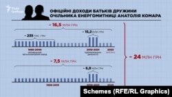 Відстежити цей зв’язок журналістам вдалося, досліджуючи непересічно елітний спосіб життя українського високопосадовця та його родини, який йде врозріз із офіційними доходами державного службовця. Він їздить на Mercedes S класу, живе в елітному ЖК в столиці. А під Києвом завершується зведення великого маєтку площею в пів тисячі квадратів, вартістю близько 70 мільйонів гривень, оформленого на тестя-пенсіонера. 17-річна донька Комара навчається у престижному платному коледжі в Лондоні. Сам чиновник ще й опікується цілою футбольною командою.