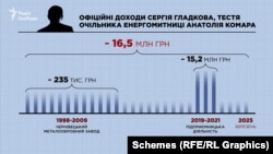 Відповідно до інформації, яку «Схеми» отримали від джерел із доступом до даних про доходи, з яких сплачувалися податки, Сергій Гладков з 1998 року до 2009 року працював на державному металообробному заводі у Чернівцях, маючи офіційну зарплату у декілька тисяч гривень на місяць. Пізніше, у 2019 році, у віці 63-х років відкрив ФОП, на який почали заходити більші суми. Таким чином сумарно за трудову кар’єру до березня 2025 року він заробив усього понад 16,5 мільйонів гривень.