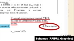 Усього в Росії журналісти знайшли 35 людей з таким прізвищем та першою літерою імені. Та увагу журналістів привернув один чоловік – 36-річний Дмитро Мєлєшенко – випускник військового училища у Єкатеринбурзі, нині зареєстрований за адресою артилерійської бригади у складі Балтійського флоту, яка бере участь у повномасштабному вторгненні Росії в Україну.