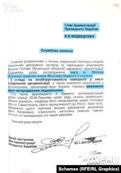 Він писав Медведчуку – керівнику Адміністрації президента – про недоцільність нагородження через «відверто антиукраїнський характер позиції Лужкова, зокрема, щодо статусу Севастополя – його приналежності до Росії».