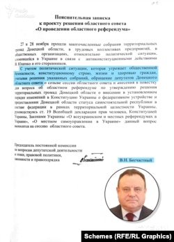 Про це свідчить пояснювальна записка, в якій він писав, що це питання виноситься на обласну сесію «з урахуванням політичної ситуації, яка загрожує громадській безпеці, конституційному ладу, життю і здоров’ю громадян, враховуючи зібрання територіальних громад та звернення депутатів Донецької облради». Бесчастний також погодив проєкт рішення про проведення референдуму.