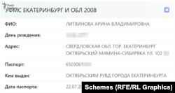 У витоках із баз даних жителів Єкатеринбурга за 2008 рік «Схеми» знайшли інформацію про громадянку РФ Аріну Літвінову з такою ж датою народження, як в української судді, із зазначенням даних її російського паспорту. Там же зазначено її місце реєстрації в Єкатеринбурзі, яке збігається із вказаним у витягу з системи «Роспаспорт», де також є її фотографія.