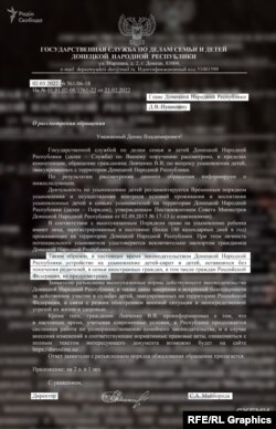 «Зараз законодавством «Донецької народної республіки» влаштування на усиновлення дітей-сиріт та дітей, що залишились без опіки батьків, в сім’ї іноземних громадян, в тому числі громадян Російської Федерації, не передбачено», – йдеться в документі, датованому початком березня 2022 року, в якому директорка Державної служби з прав сім’ї та дітей угруповання «ДНР» Світлана Майборода звітує перед Пушиліним, що усиновлення українських дітей росіянами поки не є можливим.