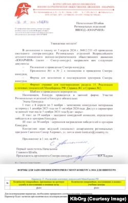 Відповідно до даних із витоку, у жовтні 2024 року перший заступник начальника головного штабу «Юнармії» Віктор Кауров розіслав листи регіональним осередкам про проведення обов'язкового щорічного «смотр-конкурсу». У них ідеться про те, що штаби-переможці визначать після оцінки наданих документів. Зокрема – довідки для підтвердження 15 пункту («Реалізація ключових показників Міноборони РФ»).