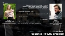 Голос Ольги Биковської також повністю співпадає з голосом на опублікованому українською спецслужбою аудіозаписі. Вона підтвердила Радіо Свобода, що її чоловік перебуває у Севастополі, уточнивши, що він лікується у шпиталі після поранення. Де саме – каже, що не знає. Після цього Ольга Биковська перервала розмову та скидала подальші дзвінки. На повідомлення у соціальних мережах ані Роман Биковський, ані його дружина більше не відповіли.