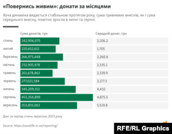 «У серпні ми з партнерами за три дні зібрали 235 мільйонів гривень на 10 тисяч FPV-дронів і боєприпаси до них. Це пояснює різке зростання проти середнього показника», – пояснили Радіо Свобода в пресслужбі фонду.