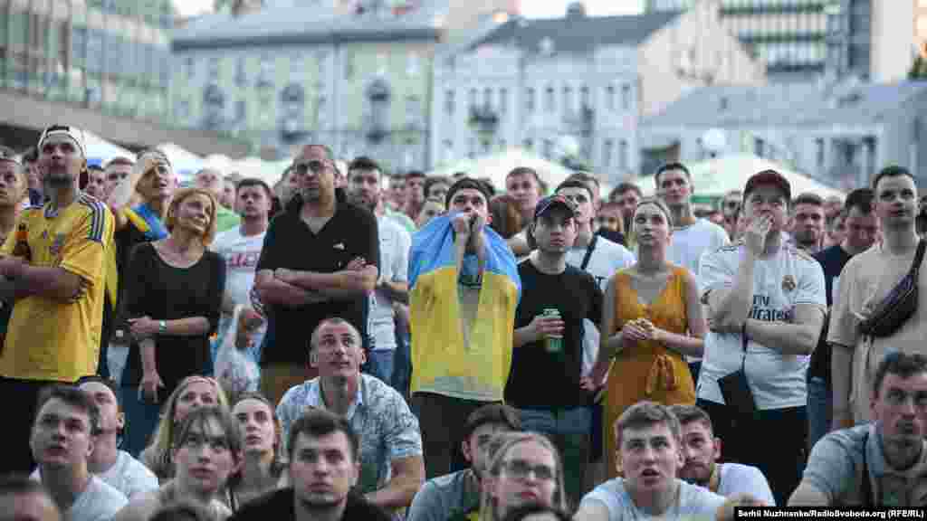 Збірна України поступилася в матчі групового турніру чемпіонату Європи з футболу. Українці програли команді Австрії з рахунком 0:1. Єдиний гол на рахунку Крістофа Баумгартнера. На 21-й хвилині він забив із кутового. Сльози і розпач вболівальників збірної України, які дивилися матч у фан-зоні на Спортивній площі у Києві, бачив фотокореспондент Радіо Свобода.