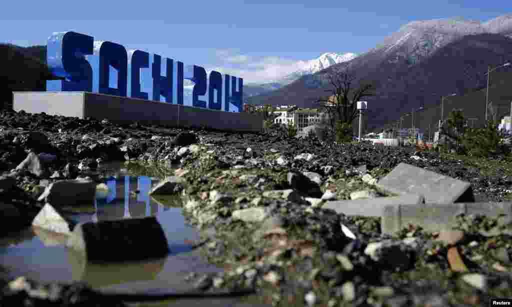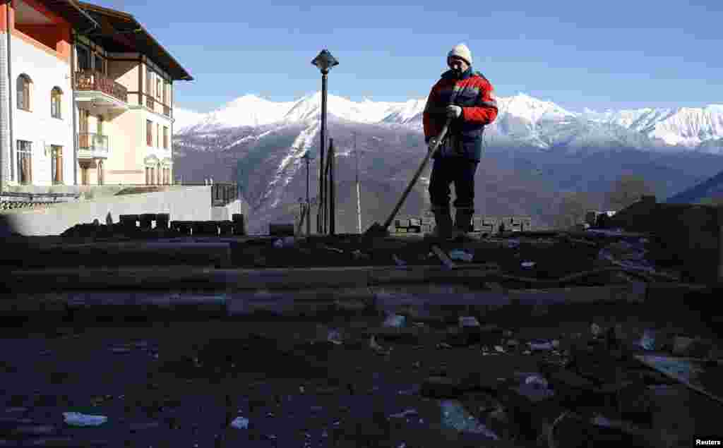 За два дні до початку Олімпійських ігор у Сочі благоустрій об'єктів ще не закінчений. Робочі поспіхом розбирають будівельне сміття, підмітають вулиці і алеї і озеленюють територію.