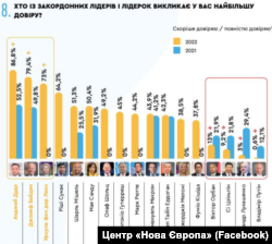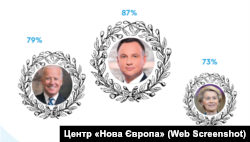 Цікаво, що вже другий рік поспіль Дуда виходить на перше місце – в 2021 році він користувався довірою 52,5 відсотків українців, а з початком повномасштабного вторгнення проти України рівень довіри зріс радикально.
