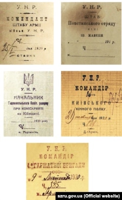 На цих бланках є такі написи: «Канцелярія Головного Отамана Військ Української Народної Республіки. Ставка» (липень 1920 р.), «У.Н.Р. Ад’ютант Головного Отамана Військ Української Народної Республіки. Ставка» (березень 1920 р.), «У.Н.Р. Штаб Повстанського отряду імені Ів. Мазепи» (191_ р.), «У.Н.Р. Командір 5-го Київського кінного полку. Д. Армія» (жовтень 1920 р.), «Директор Державного банку України» (березень 1919 р.), «У.Н.Р. Українська дипл. Місія в Речіпосполитій Польській. Військовий референт. Варшава» (березень 1920 р.) та інші.