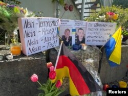 На них зображені імовірні фото загиблих, поруч з якими лежать квіти і стоять свічки. А також написи німецькою: «Ні – тероризму! Ні – війні! Ні – смерті! Ні – вбивству!» і «Українці району глибоко сумують та засуджують злочин».