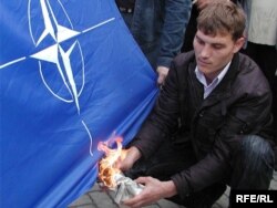 «НАТО – ні, Росія – так!» – із такими вигуками понад сотня представників Російського блоку, партії «Союз» і Компартії прийшла на один із майданів Сімферополя в той час, коли там мала розпочатися акція на підтримку вступу України до Північноатлантичного союзу. Ця акція зараз проходить півднем України під гаслом: «Україна: НАТО – так!».