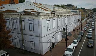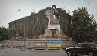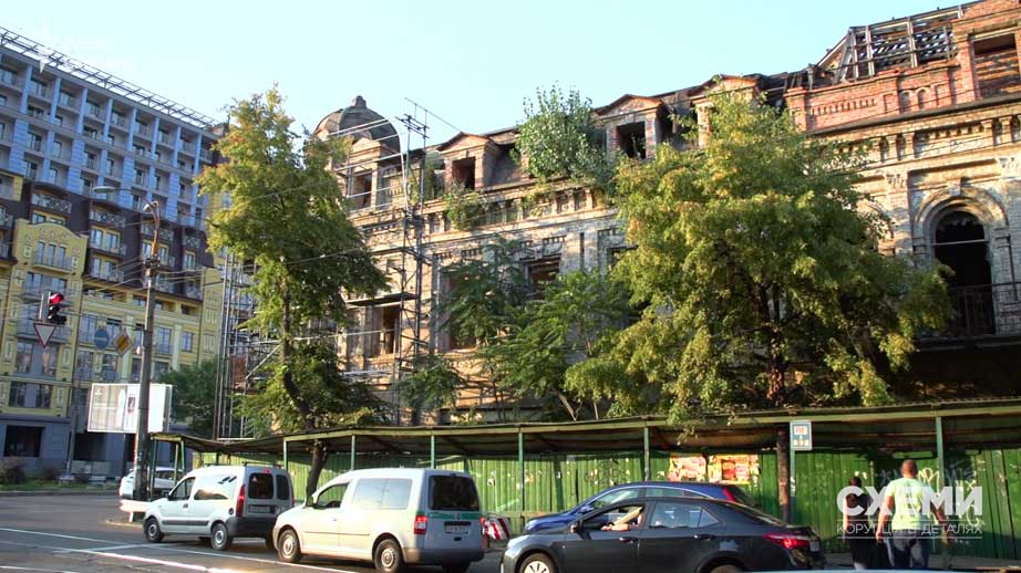 Але наразі будинок стоїть невідреставрований, фасад завішено банером, який на початку вересня замінили на свіжий.
