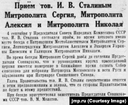 Пізно ввечері 4 вересня 1943 року Йосип Сталін зустрівся із Сергієм (Страгородським), митрополитом ленінградським Олексієм (Сіманським) та митрополитом київським Миколою (Ярушевичем).