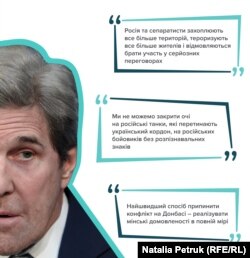 «Ми сподіваємось, що Росія розуміє, що дипломатичне рішення тут найкраще. Проте ми не можемо заплющити очі на російські танки, які перетинають український кордон, ми не можемо заплющити очі на російських бойовиків без розпізнавальних знаків. Вони перетинають кордон і пліч-о-пліч воюють із сепаратистами. Ми бачимо ракети й іншу важку техніку, яку передає Росія, щоб посилити конфлікт», – зазначав Керрі під час зустрічі з президентом України Петром Порошенком.Після переговорів із президентом Порошенком Джон Керрі зустрівся з прем’єром Арсенієм Яценюком. На спільній пресконференції з очільником українського уряду держсекретар озвучив позицію США, яка закликала до припинення вогню на сході, Росія мала б забрати важку техніку з Донбасу і дозволити Україні відновити контроль над кордоном.