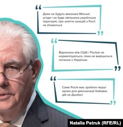 Держсекретар також наголосив на тому, що саме Росія має зробити перші кроки в деескалації бойових дій на Донбасі, зокрема відвести важке озброєння і дати доступ спостерігачам ОБСЄ не лише до лінії розмежування на Донбасі, але і до неконтрольованої українською владою ділянки кордону з Росією. Пізніше Рекс Тіллерсон заявив, що відносини між двома країнами – США і Росією – не нормалізуються, допоки не вирішиться питання з Україною.