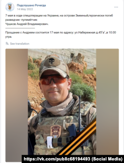 Ще один похований Олексій Баранов був сержантом військової частини 43071, пише російський глава Севастополя Развожаєв. Ця частина – 388-й морський розвідпункт, що дислокується у Севастополі. Развожаєв у своєму телеграм-каналі повідомляв, що Баранов був поранений на Зміїному на початку травня, пізніше помер від ран.