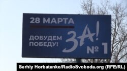 На въезде в Покровск со стороны Доброполья нас встречает борд. На нем по-русски написали: «28 марта. Добудем победу! За! №1». Таких бордов мы немало встретили на пути к окружной избирательной комиссии.