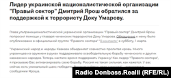 Саме повідомлення з’явилося на сторінці російської соцмережі «ВКонтакті» нібито «Правого сектору», але і Ярош, і організація це спростовують. Більш показовим у цьому є те, що Умаров помер, чи загинув, ще у 2013 році. Пізніше, незважаючи на спростування інформації про «звернення», глава Чечні Рамзан Кадиров згадував Яроша у цьому ж контексті та погрожував йому знищенням.