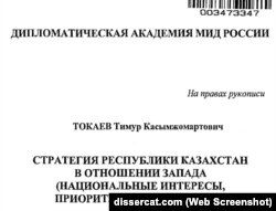 В інтернеті можна знайти дисертацію Тимура Токаєва, яку він захистив в академії МЗС у 2009 році: «Стратегія республіки Казахстан щодо Заходу. Національні інтереси, пріоритети, напрямки». Прізвище Назарбаєва згадується у ньому 112 разів на 215 сторінках. Путін зустрічається один раз, Обама – шість, Буш – 14 разів. «Росія – єдиний союзник Казахстану», – пише Токаєв-молодший.
