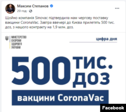 29 квітня міністр охорони здоров’я Максим Степанов на своїй сторінці у фейсбуці анонсував прибуття ще 500 тисяч доз китайської вакцини, які Київ має отримати у п’ятницю ввечері.