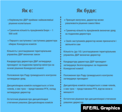 Одна з відмінностей документу «Голосу» – в структурі конкурсної комісії. В чинній редакції комісія складається з дев’яти осіб – по троє від президента, уряду та парламенту. Депутати пропонують структуру комісії, за якою трьох людей делегуватиме президент, а трьох – Кабінет міністрів на підставі пропозицій антикорупційних міжнародних організацій, перелік яких має затверджувати Міністерство закордонних справ.