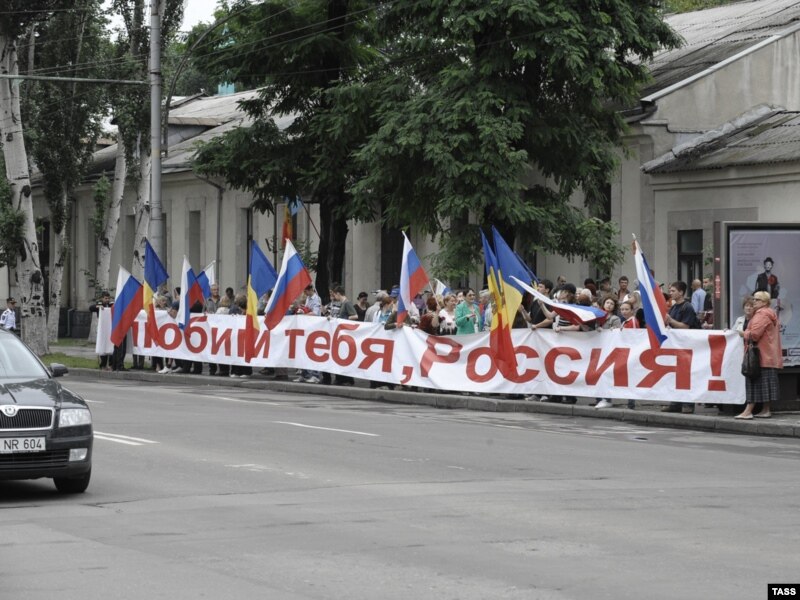 Мітинг перед посольством Росії в Кишиневі. Проросійські демонстранти тримають банер з написом «Ми любимо тебе, Росіє!» на протест проти указу про відзначення 28 червня як Дня радянської окупації Молдови