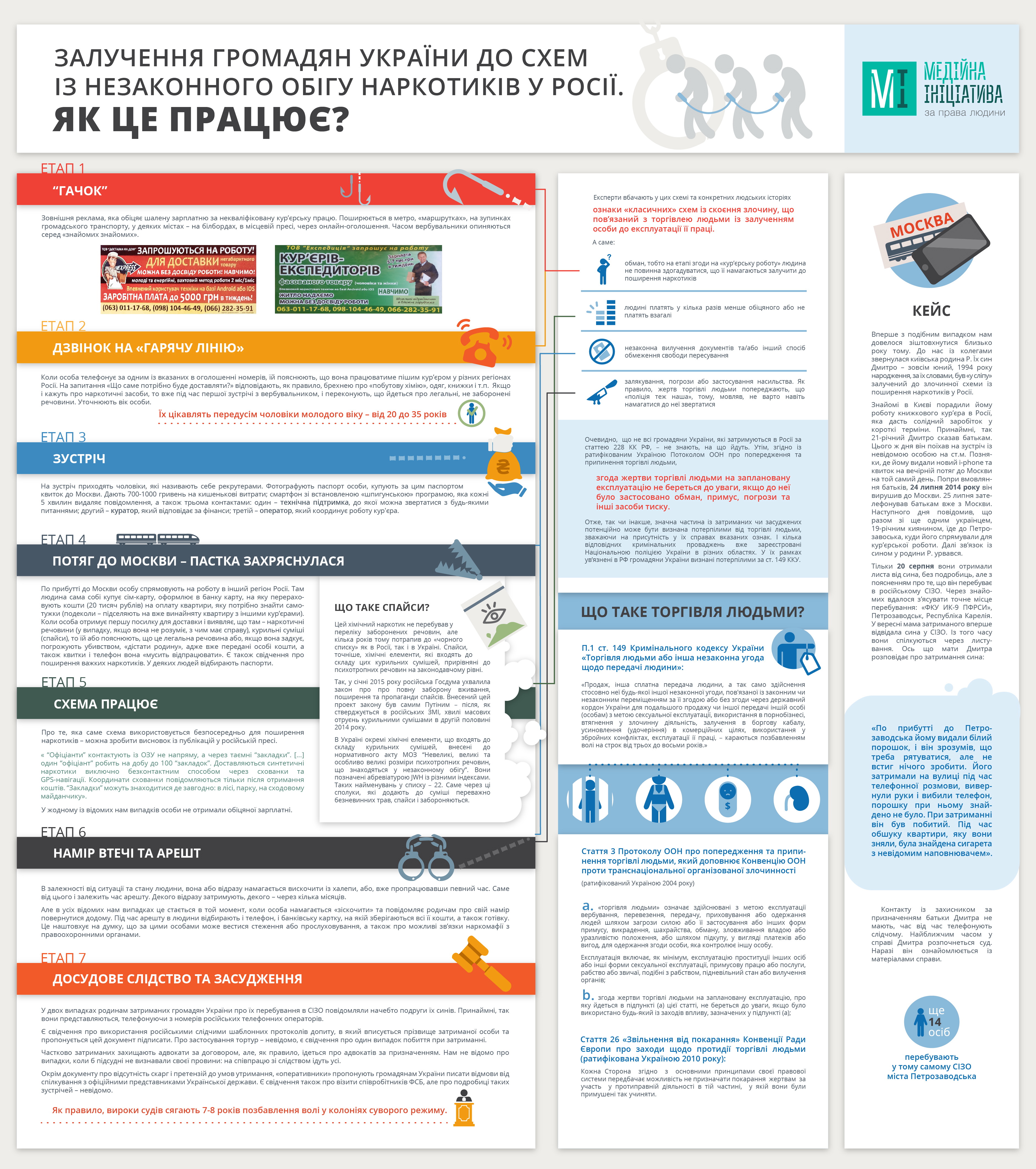 Протягом попередніх року-півтора сотні громадян України були затримані та засуджені в Російській Федерації за обвинуваченнями в розповсюдженні наркотичних речовин. Правозахисники вважають, що багато хто з них міг стати жертвами злочинів, пов’язаних із торгівлею людьми із залученням особи до експлуатації її праці. Здебільшого в халепу українців потрапляють через яскраву рекламу, що обіцяє швидкий та легкий заробіток за некваліфіковану працю кур’єрів-експедиторів: до «сиру в мишоловці» людей штовхає фінансова скрута. Ці оголошення ви досі можете бачити, наприклад, у Київському метрополітені, і не схоже, що правоохоронні органи докладають достатньо зусиль, аби згорнути діяльність схеми на території України. Тим часом, кількість затриманих за «наркотичними» статтями українців зростає, а Росія цю статистику намагається використати у власних пропагандистських цілях.