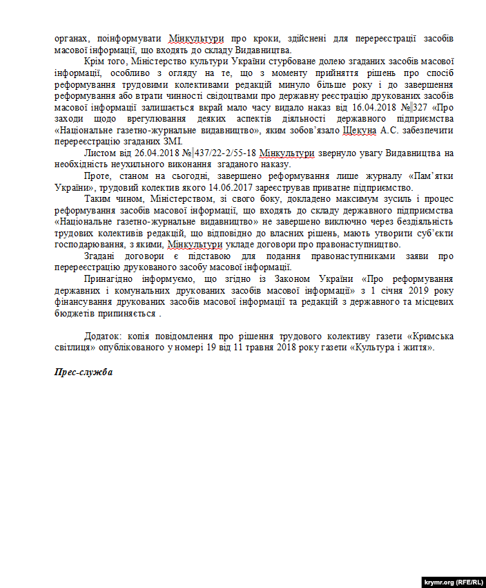 Відомство запевняє, що стурбоване долею видань, а також, що своїм указом зобов'язало Андрія Щекуна забезпечити перереєстрацію газет і журналів «Національного газетно-журнального видавництва», зокрема й «Кримської світлиці».