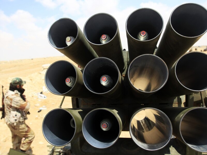 Реактивна система залпового вогню «Град» лівійських повстанців на лінії фронту поблизу міста Адждабія, 19 квітня. Такими ж користуються і війська Каддафі