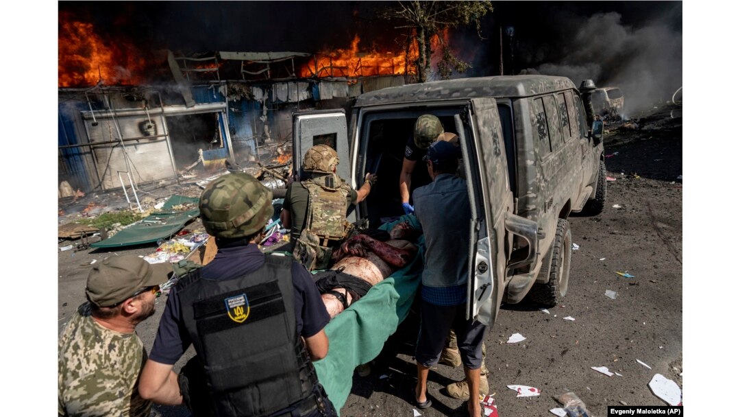Парамедики несуть пораненого чоловіка в машину швидкої після російського обстрілу ринку в Костянтинівці, 6 вересня 2023 року