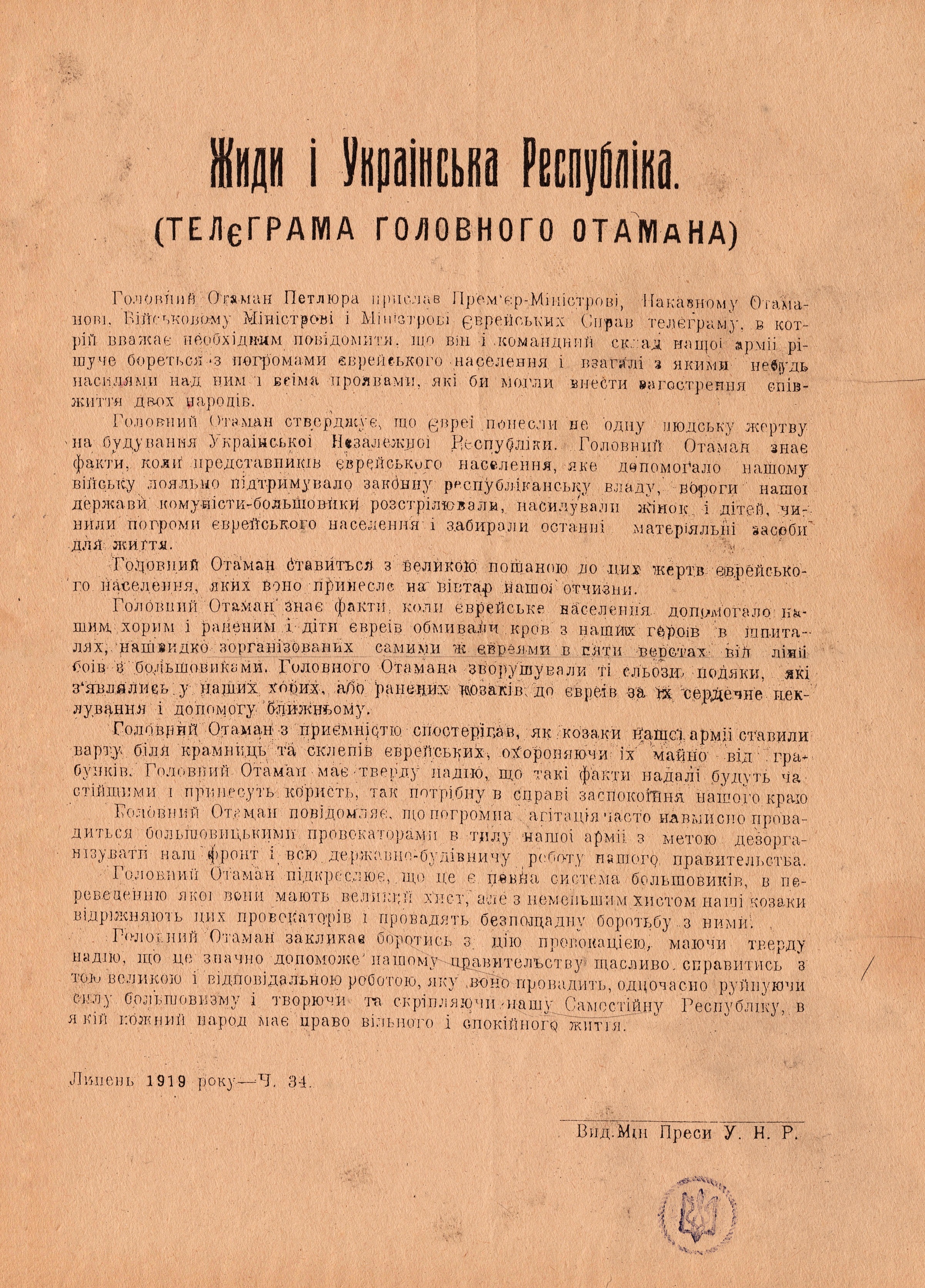 Повідомлення про телеграму головного отамана військ УНР Симона Петлюри, датованої липнем 1919 року про те, що керівництво української армії веде рішучу боротьбу з тими, хто вчиняє погроми проти єврейського населення. Йдеться, зокрема, про необхідність «безпощадної боротьби» із більшовицькими провокаторами, які вдаються до «погромної агітації». ЩОБ ПРОЧИТАТИ текст цього артефакту, у вигляді листівки (29×40,5 см.), виданої Міністерством преси УНР, відкрийте її у великому форматі, натиснувши на зображення.