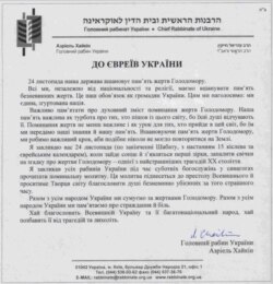 А всіх рабинів України він закликав під час суботніх богослужб у синагогах прочитати поминальну молитву за душі безневинно убієнних у ті страшні часи.